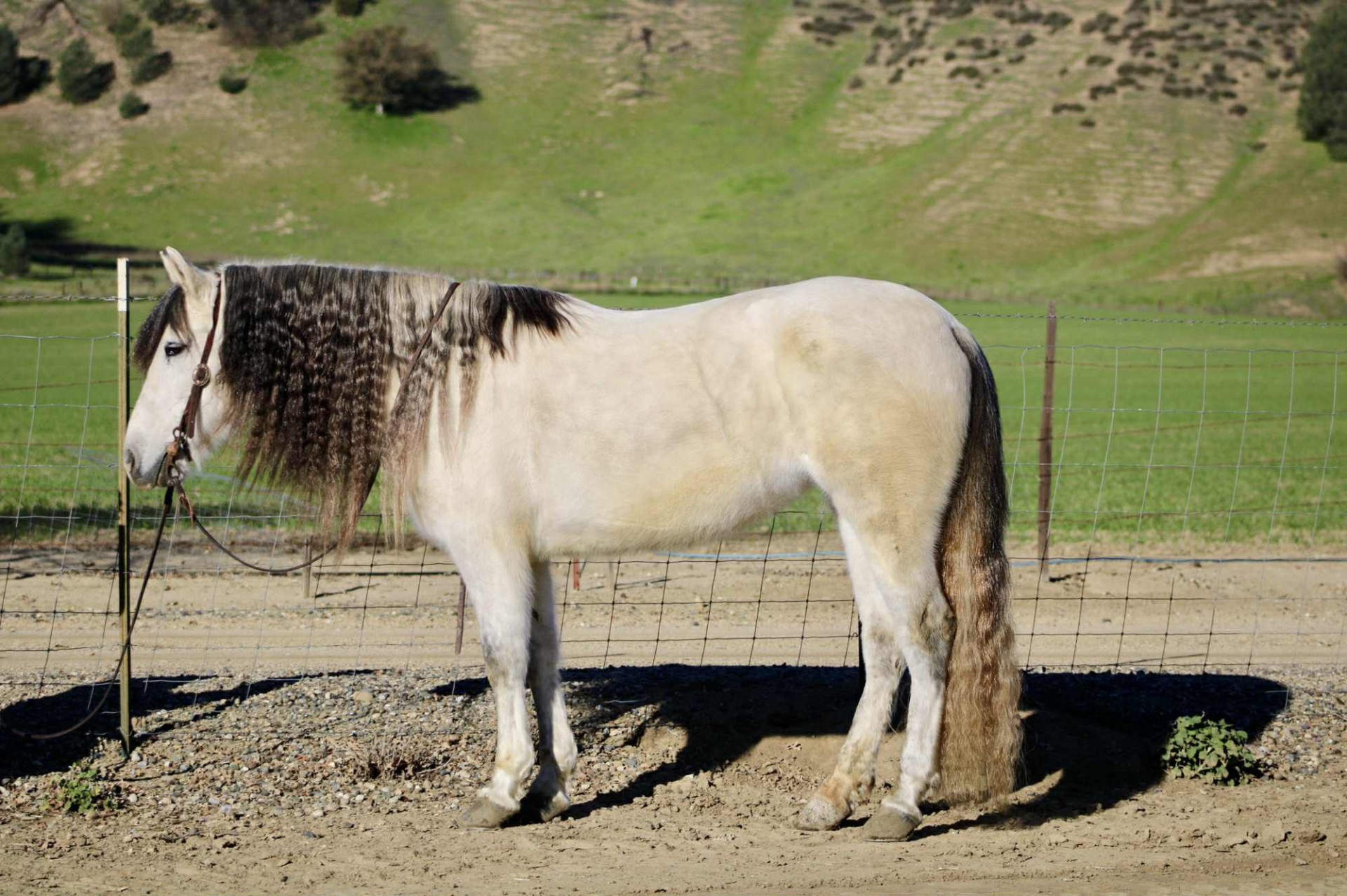 Crystal is a stunning 8-year-old Quarter Horse cross mare standing 14.2HH. With her thick, flowing mane and tail, she looks like she stepped straight out of a fairytale, and you’ll feel like royalty every time you ride her! Crystal is safe, gentle, and incredibly friendly. She is the ultimate trail horse and absolutely loves going out on rides. She has experience with busy highways, rushing rivers, bridges, bicycles, and everything in between. She travels out at a great, steady pace, keeps up beautifully, and never offers any fuss, refusal, spook, bolt, or rear. She confidently crosses water and is truly a “point-and-go” type of horse. In the arena, Crystal is just as well-mannered and easy to ride. She carries herself in a nice, collected frame, has smooth, rocking-chair gaits, knows both leads, and offers a fantastic stop with a soft backup. Her movement is elegant, fluid, and eye-catching, like something out of a movie. She navigates obstacles and trail courses with ease and is always willing to please. Crystal stands quietly tied, is excellent for the farrier, and is safe for anyone to handle or ride. She is not “marish” in behavior and gets along well with other horses. She loads and hauls perfectly and is an absolute pleasure to have around the barn. If you’re looking for a beautiful, reliable, and trustworthy mare who is a joy both on the ground and under saddle, Crystal is your girl. She is located in Bitterwater, CA. For more info or to come see her in person contact Cheyenne Rey at 831-537-8746.