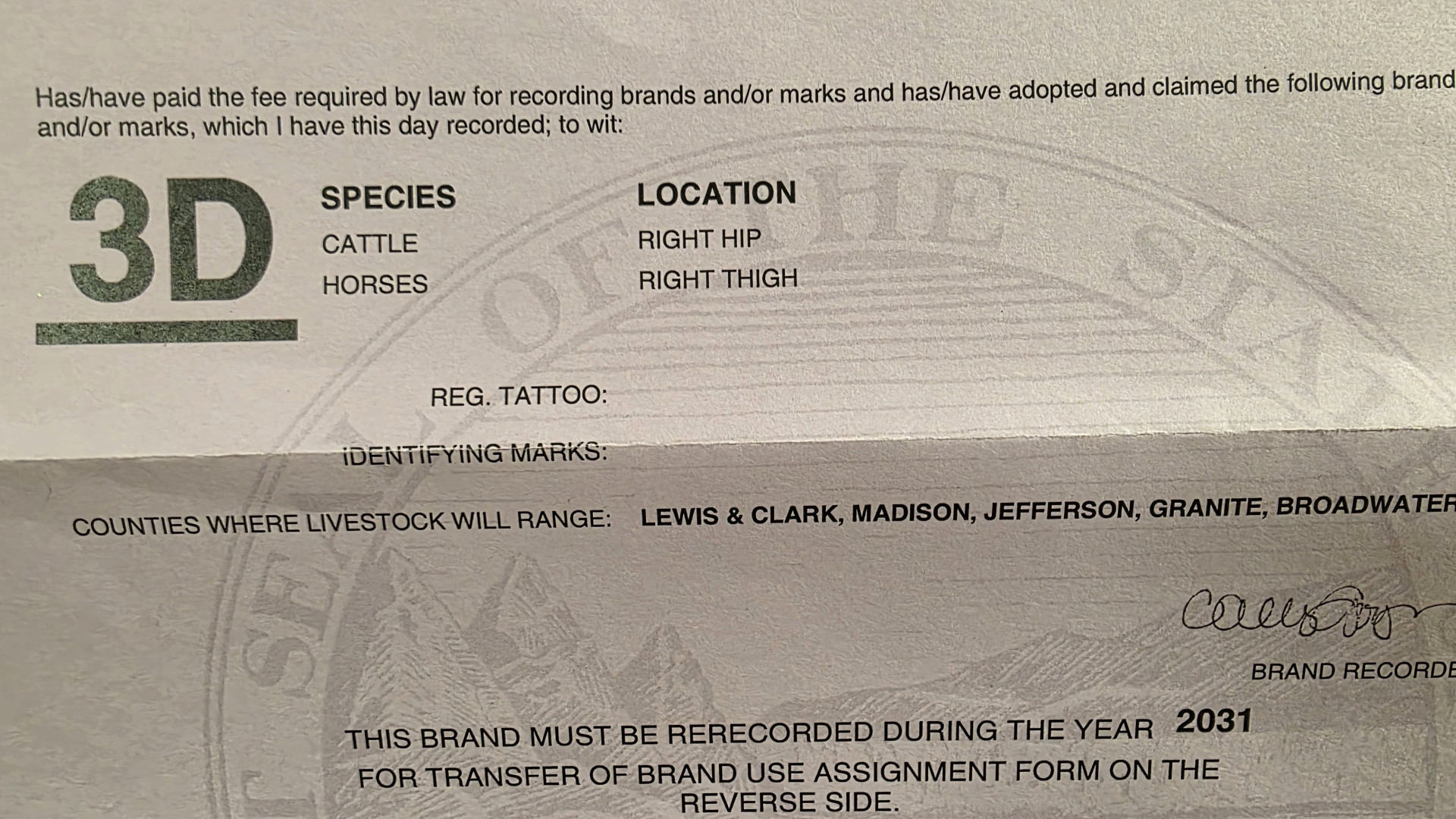 Montana 3D bar brand for sale. This brand is registered for the following livestock, location and Montana county ranges. The range counties can be updated and revised with the transfer of this brand. Custom L&D Electric Branding Irons shall also transfer with the sale of this brand.