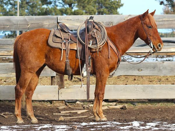 "Badger" - 2019 Sorrel Quarter Horse Gelding that stands 14 hands. He is gentle and goes where you point him, crosses water, logs, tarps, and teeter totters. Badger side passes to the mounting block to let you get on. I dragged poles and tarps with him, gathered cattle, and he’s been in the mountains packing. My 12-year-old sister rides him all over the place. He has a scar on his left hind hock that is only cosmetic and does not bother him. He is easy to catch and good with his feet. Badger is also used to having a whip cracked off him. Come check him out!