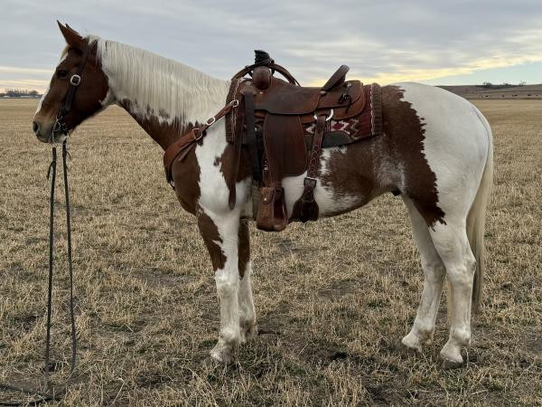 "Hondo" 2015 Sorrel & White Paint Gelding that stands 15 hands tall. Hondo is the type of horse that any age or experience level can appreciate. Super gentle with excellent ground manners. Whether you’re looking for one to ride every day or just on the weekends or just a couple times a year, Hondo will fit the bill. He has seen tons of ranch and trail miles. Goes up and down hills and crosses water with ease. Super nice all-around horse that is user friendly.