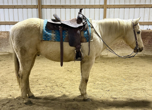 "Ruger" 2011 Palomino Quarter Horse Gelding. Ruger is a been there done that kind of guy. Ruger stands around 14.2 and is the perfect size for everyone. He is quiet, gentle, willing to please, and comes when he’s called in the pasture. He can sit for any amount of time and will ride out the same every time. He’ll ride out on his own or in a group without any fuss. He’s been shown in 4-H, extreme trail challenges, cattle sorting, overnight camping trips, he’s been roped off of and ponied colts. Ruger loads, bathes, clips, ties, shoes, etc. He travels well and eats and drinks on the road. Ruger is traffic safe, crosses bridges, drags logs, carries flags, and goes through water with ease. He has a true one hand neck rein, takes his leads, side passes, spins, has a nice stop, and rides bridle less. Ruger has been ridden by all levels of riders.