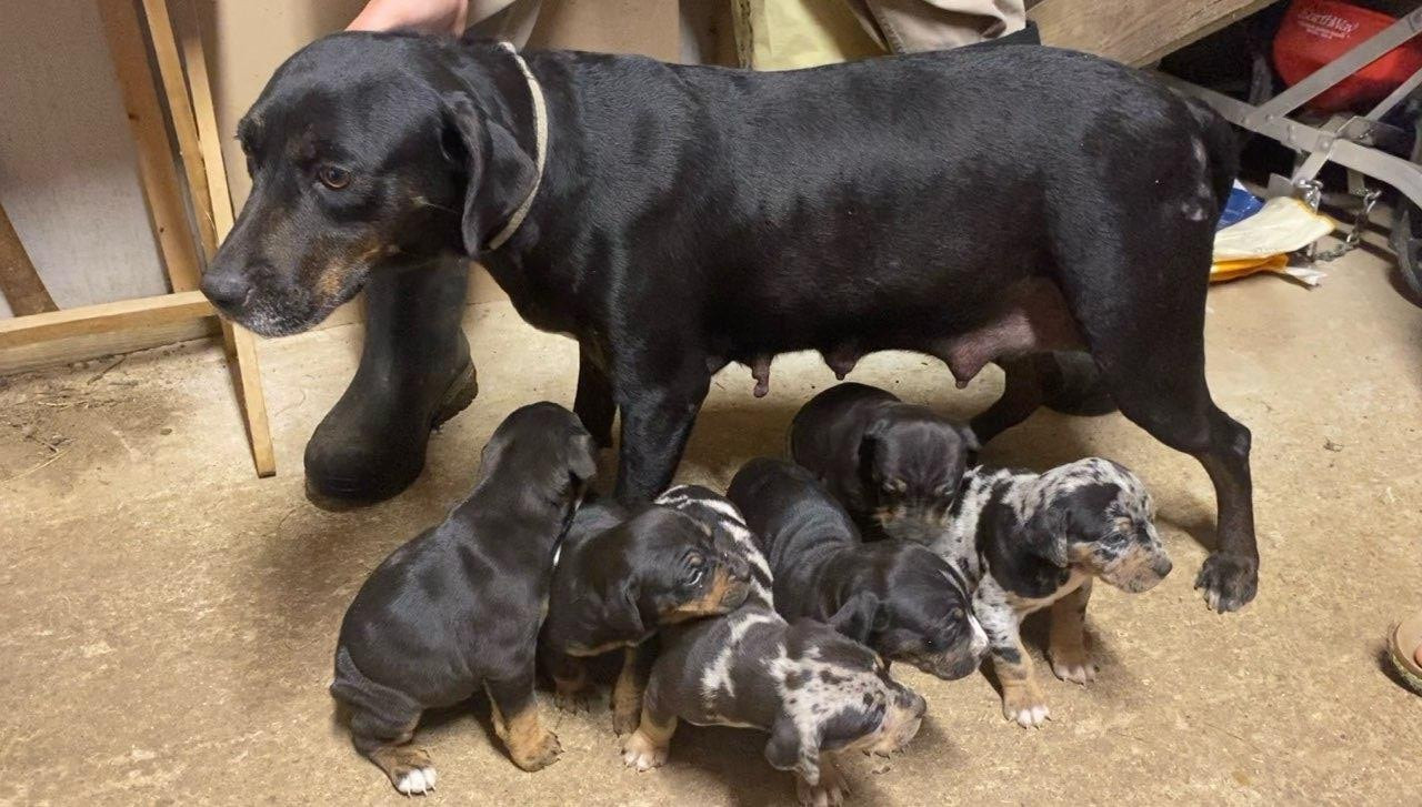 2 Male and 4 Female Registered w/NALC Catahoula puppies born Dec. 18, 2025. Momma is a very non aggressive, mild-mannered all-around Farm dog. We have used her to blood trail deer and she will accompany us when moving cattle. She is in daily contact with barn cats, chickens, ducks, geese, goats, sheep, cattle and horses and other than barking at cows when moving them she has never shown any aggression to any of our animals in her almost 5 years of age. Pick of the Litter is currently still available, 2 Blue Leopards and 4 Blacks with trim. Dewormed and Vaccinated. My 2 young daughters are currently spoiling theses Pups rotten.