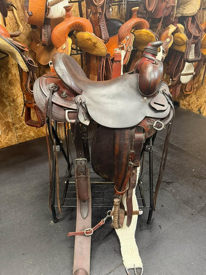 This saddle features a 16" hard seat, 4 1/2’ Cantle, 13 1/2" swells, post horn with leather rope strap and leather dally wrap, 6 leather ties, 6 1/2" gullet, QH bars, rawhide wrapped modified association tree, round skirt, pre-twisted stirrups, 7/8 drop rigging, back cinch, new front cinch, fleece is good and weight is around 40lbs.