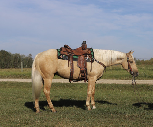 You will definitely take a second look at Sandhill. He is a beautiful 14.2 HH 4 Yr Old Palomino with a shiny white mane and tail. Sandhill has such a sweet, loving, willing attitude that cannot be beaten, and has the looks that will definitely get noticed wherever you go. He has been ridden out on the trails, and checking yearlings on the ranch. He crosses water and deadfall with confidence. He has been on numerous trail rides and will go anywhere that you ask him to go. He will take the lead or fall somewhere in the middle or take up the rear, he does not mind at all. Sandhill has been ridden around the barrels and poles and would make a great Jr Rodeo Horse. He is very well started in the breakaway roping and hauled to some Jackpots. He has a nice smooth loop and a ground covering walk. He loads well in the trailer, gets along with other horses, and likes his bath. Sandhill is an outstanding young gelding that shows tons of potential to go any direction you desire. He is current with vaccinations,deworming, farrier and dental work. Don’t pass up the opportunity to own this nice young gelding! For More information call Geraldine (780) 542-0146 He sells at the Art Of The Cowgirl Sale in WickenburgAZ, February 28th