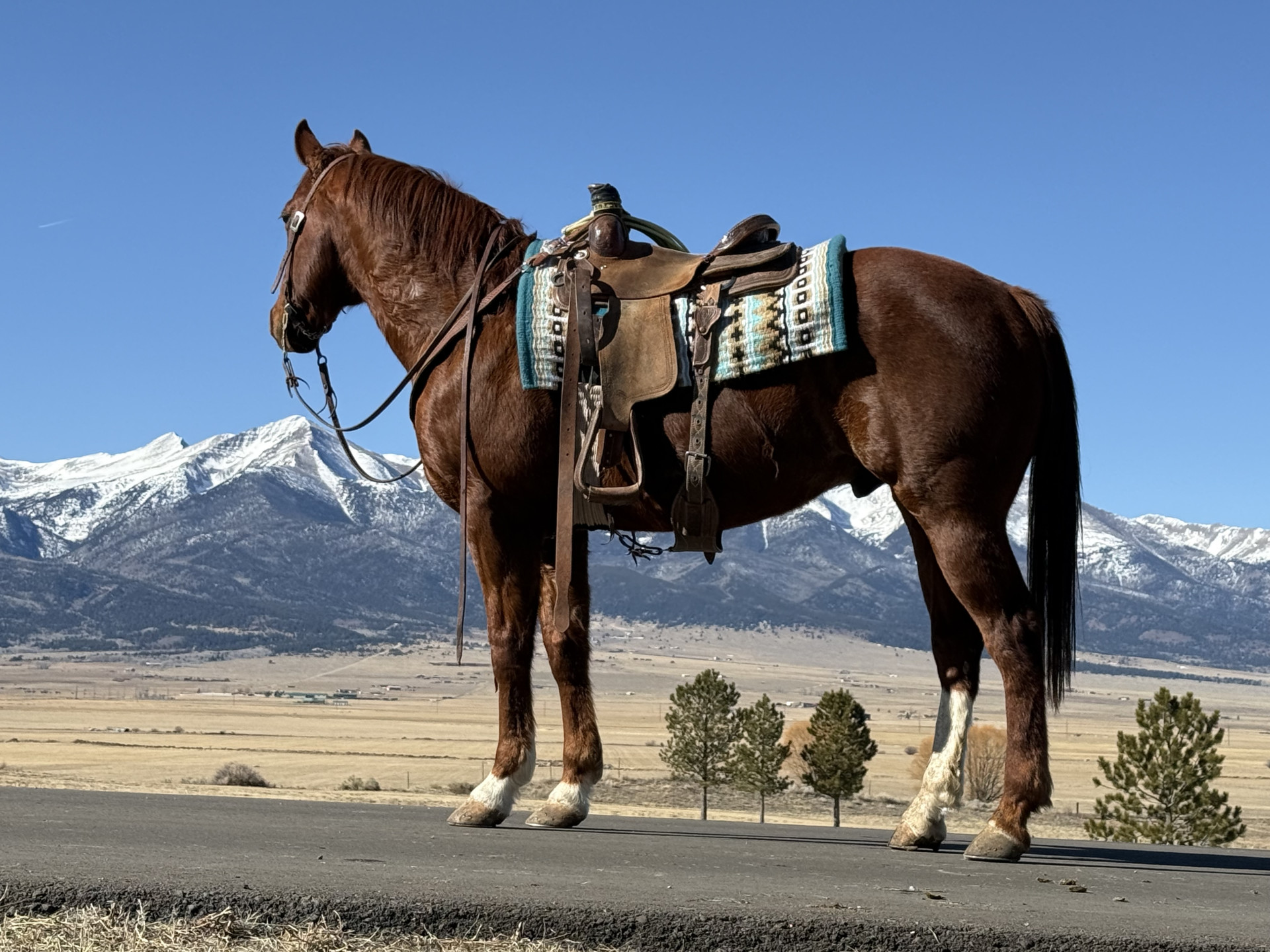 “Curtis” is like your old faithful ranch pick-up truck! He is there when you need him and does whatever you ask, from packing out elk to roping and holding steers. And he is definitely not the ugliest horse in the branding pen either! Curtis wears shoes on all 4 feet and is ready to work for you this spring. If you’re looking for a leisurely trail riding partner, check him out! He is sound with no scars or bumps. Solid sorrel gelding with some chrome! For more information, contact us at (719) 239-0154.