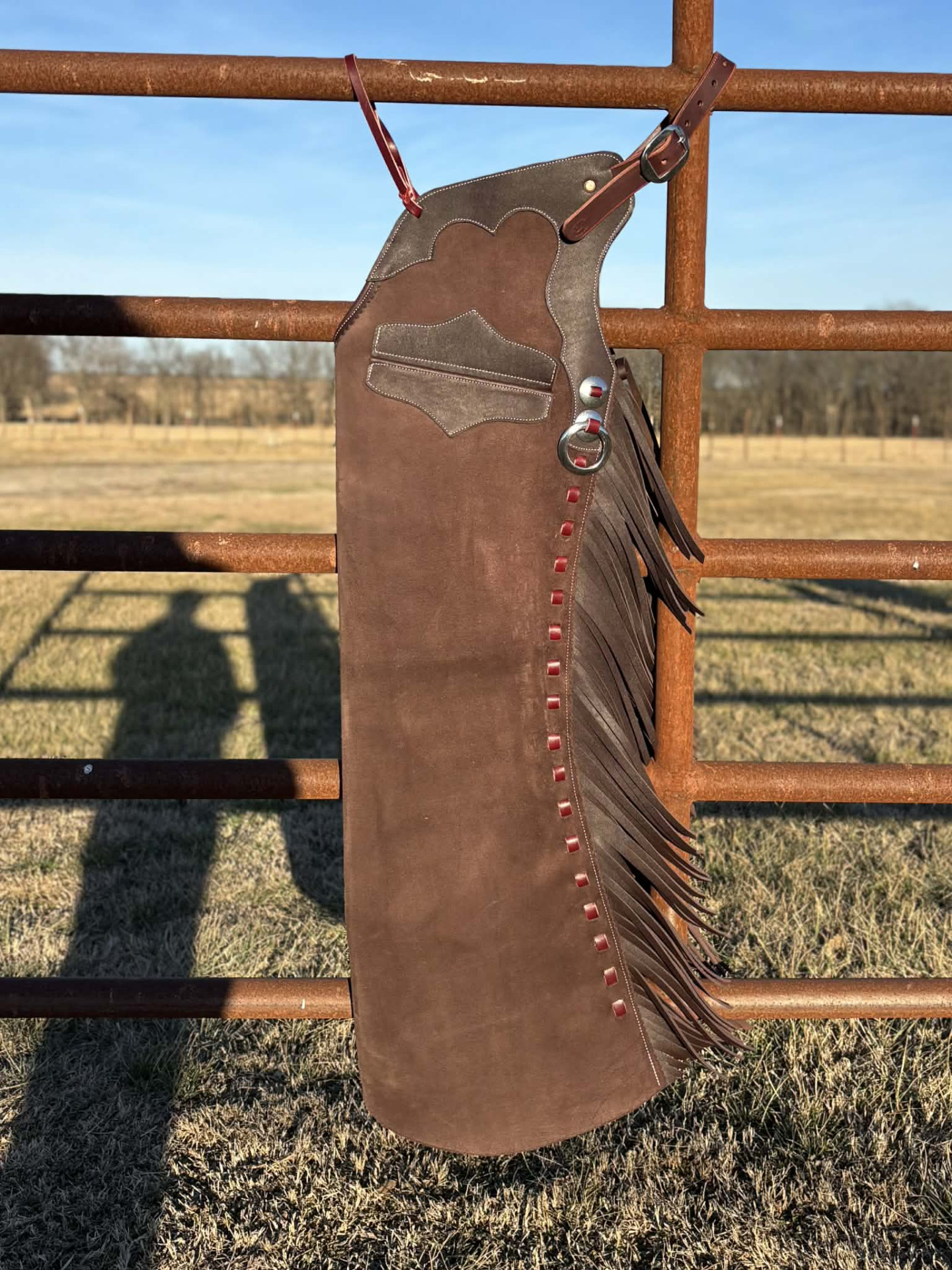 Made in the shop of DW Dixon Saddles by Kat Dixon. Fudge Rough Out Small Bell/Shotgun Hybrid Chaps with Fringe.