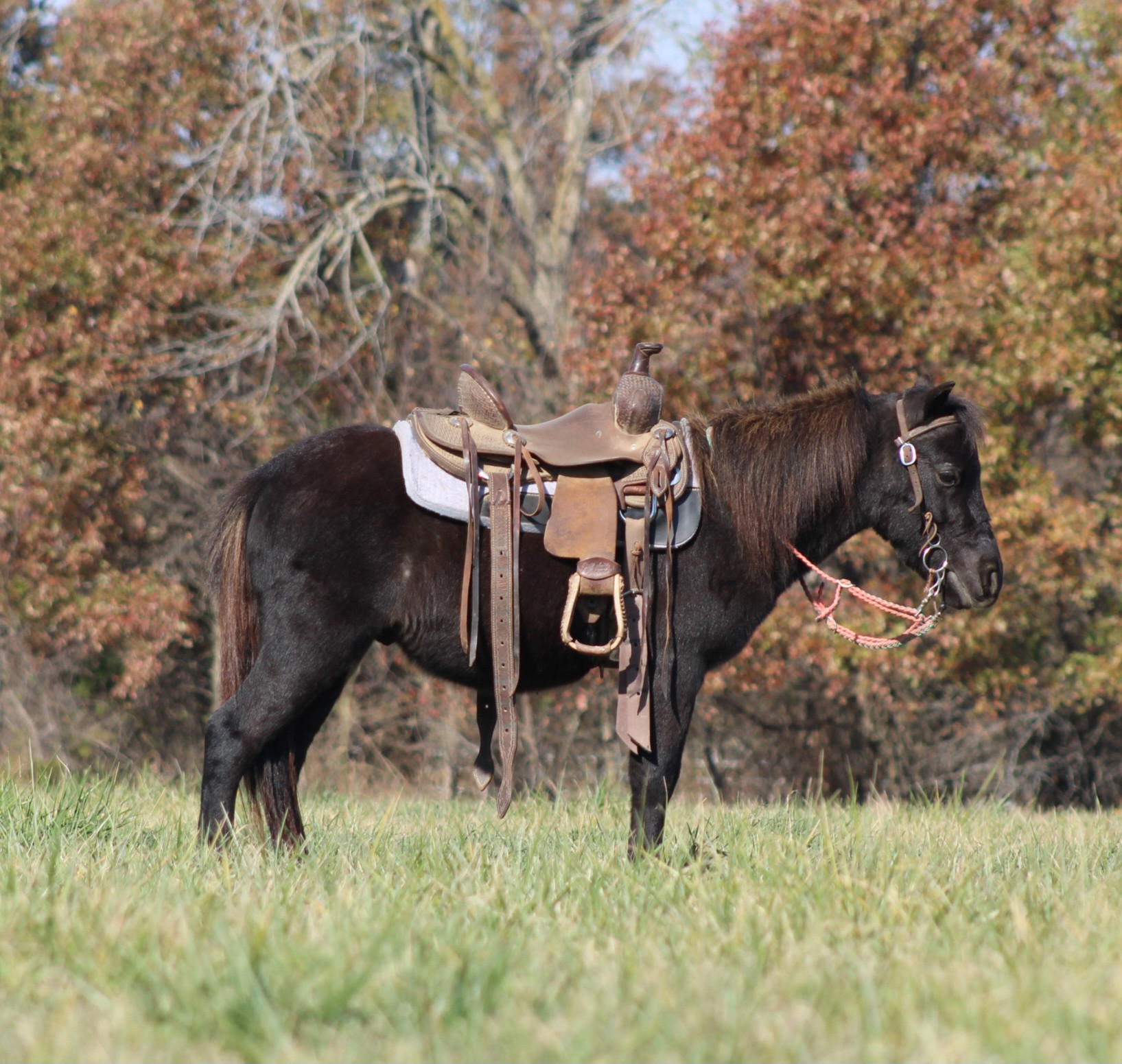 Blackjack is a 40 inch, 4 year old mini pony gelding that the whole family can enjoy. He is broke for riders of any age and is gentle, patient, and trustworthy every time you lead him out. This is the kind of pony you can put the kids on without worrying and still enjoy riding yourself. He is safe, sane, and confident, sound in every way with no blemishes. Blackjack has been ridden through the woods, down busy city streets, across cow pastures, and even to school, and he takes it all in stride. Traffic does not bother him, livestock does not bother him, and new places do not bother him. He stays calm, steady, and willing, making him a great choice for beginner riders and families wanting a pony that will take care of their kids. Easy to catch, easy to handle, and easy to be around, he has the right mind and a kind disposition. If you are looking for a dependable, family-safe mini pony that has been there and done that, Blackjack is the one you can trust to do his job every day.