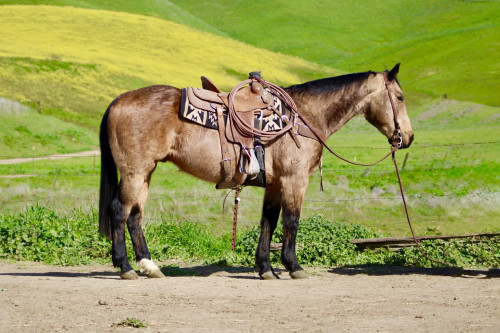 OSR SHINING PLAYBOY “Playboy” 2012 Buckskin Gelding • AQHA Registered • 15 Hands • Stout Built. If you’re searching for a gelding that combines standout looks, a big heart, and some of the most respected bloodlines in the performance horse world, Playboy is one you need to meet. He is the kind that catches your eye, earns your trust, and keeps it — a horse that’s as enjoyable to own as he is to ride. Bred for talent and longevity, Playboy is sired by OSR Sparks Oak Dunit, a son of the legendary Shining Spark, one of the most influential sires in performance horse history. On the bottom side, he traces to Freckles Playboy, Doc’s Hickory, and Doc Bar — cornerstone names known for producing athletic, trainable, and good-minded horses. These are classic bloodlines you simply don’t see very often anymore, and they continue to prove themselves generation after generation. Playboy is a more laid-back, easygoing gelding that is a pleasure in every setting. Out on the trail, he is a true cruiser — relaxed, confident, and happy to take in the scenery. He has a solid foundation of trail experience and handles a wide variety of terrain with ease. He willingly crosses water, travels through brush, and goes wherever you point him. Playboy has been used for ranch work and is comfortable stepping out to do a job or heading out for a quiet ride. He is great around traffic, wildlife, other ranch animals, and ranch equipment. Playboy has been exposed to obstacles and handles flags, tarps, and other ranch-style obstacles with a quiet mind. In the arena, Playboy has nice style and a smooth way of going. He walks, trots, and lopes easily, carries himself correctly, and offers a soft, comfortable lope. He is responsive, easy to guide, and always aims to please his rider. Playboy ties, clips, and is good for the farrier. He is a confidence-building kind of gelding — steady, sensible, and honest — and one that is safe day in and day out. Beginners can get along well with him, yet he is still quality enough for an experienced rider to appreciate. Built stout with good bone and substance, he feels solid underneath you and ready for anything. Playboy is a rare find — a good-minded, good-moving gelding with timeless bloodlines, a laid-back attitude, and a whole lot of try. Located in California. Shipping can be arranged nationwide. If you would like to find out more about Playboy, please contact: Longhorn Ranch – Dina 831-537-1915