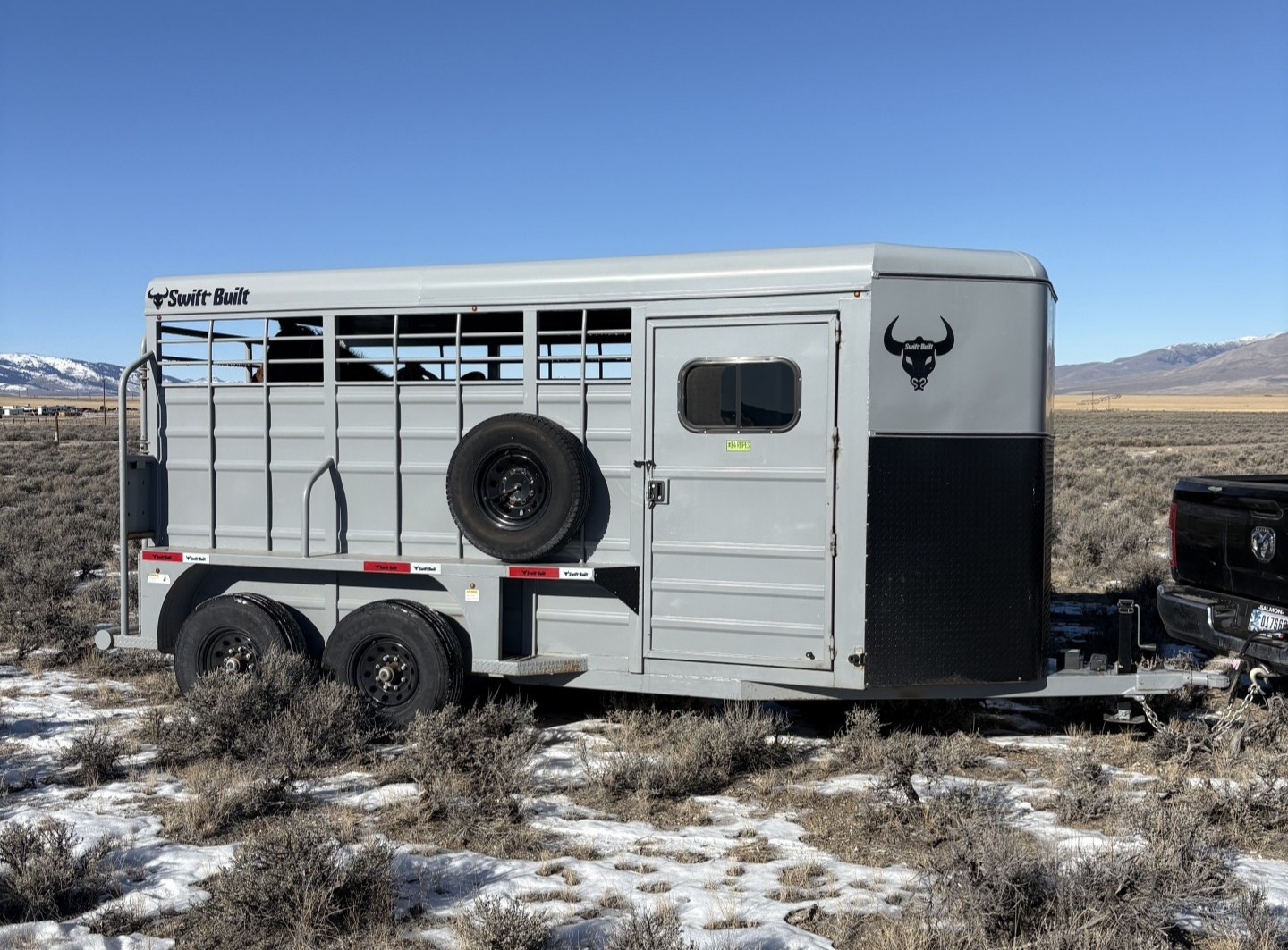 I’m the original owner on this lightly used swiftbuilt bumper pull trailer, 14 ply tires and spare, lots of tread left, escape door on left side, brakes and lights good, tack room with swingout saddle rack, 7k torsion axles.