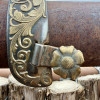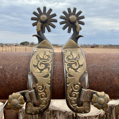 Great pair of spurs made by Peewee Peeble. Double mounted with brass scrolls on the outside heel band and a brass steer head on the inside heel band. Rowel pins are covered and another piece of brass on the shank as well. Bayers style flowers on the outside buttons. Marked PEEBLES and numbered 264