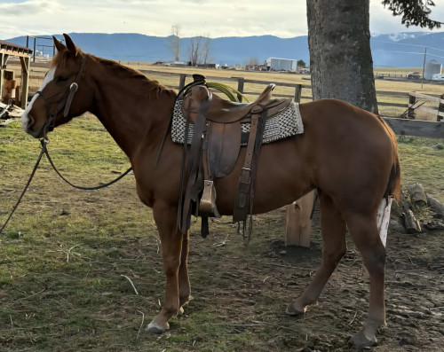 2019 AQHA registered mare. She has primarily been used for all aspects of ranch work (gathering, doctoring, sorting, branding, etc.). She is confident in steep terrain! She has been utilized to pack elk out of the mountains on various hunting trips! She is easy to shoe and is hobble broke too! Gets along great with other livestock and animals! She has been hauled extensively to many events/locations. Take her to a team penning or ranch sorting, finish her as a rope horse, or continue to use her as a ranch horse! Confident intermediate level suitable. Additional information/pictures/videos available upon request.