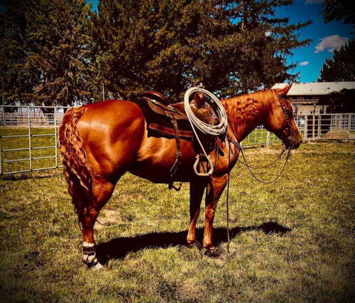 About 15 1/2 hands and weighs about 1200 pounds. He is very athletic and has the mental capacity to take the pressure. Seems like the more pressure you put on him, the better he gets. I’ve owned Spud for about three years. He has been my right and left hand, he is my go to for everything from trail riding to ranch work, to working head side, hill, side, break away, branding and has even splashed around in the cutting pen at club shows. Whatever you throw at him, he just handles it. He has had all different levels of riders on him. Traffic doesn’t bother him, big rocks or bridges. He clips, loads, hauls like a soldier.