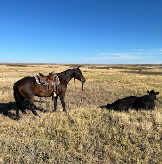 15.1 hand, well-built gelding with a big solid ranch horse foot. Has been used lots ranching and doctoring on our own place and I run a grazing co-op. No shortage of work for a hardworking gelding.