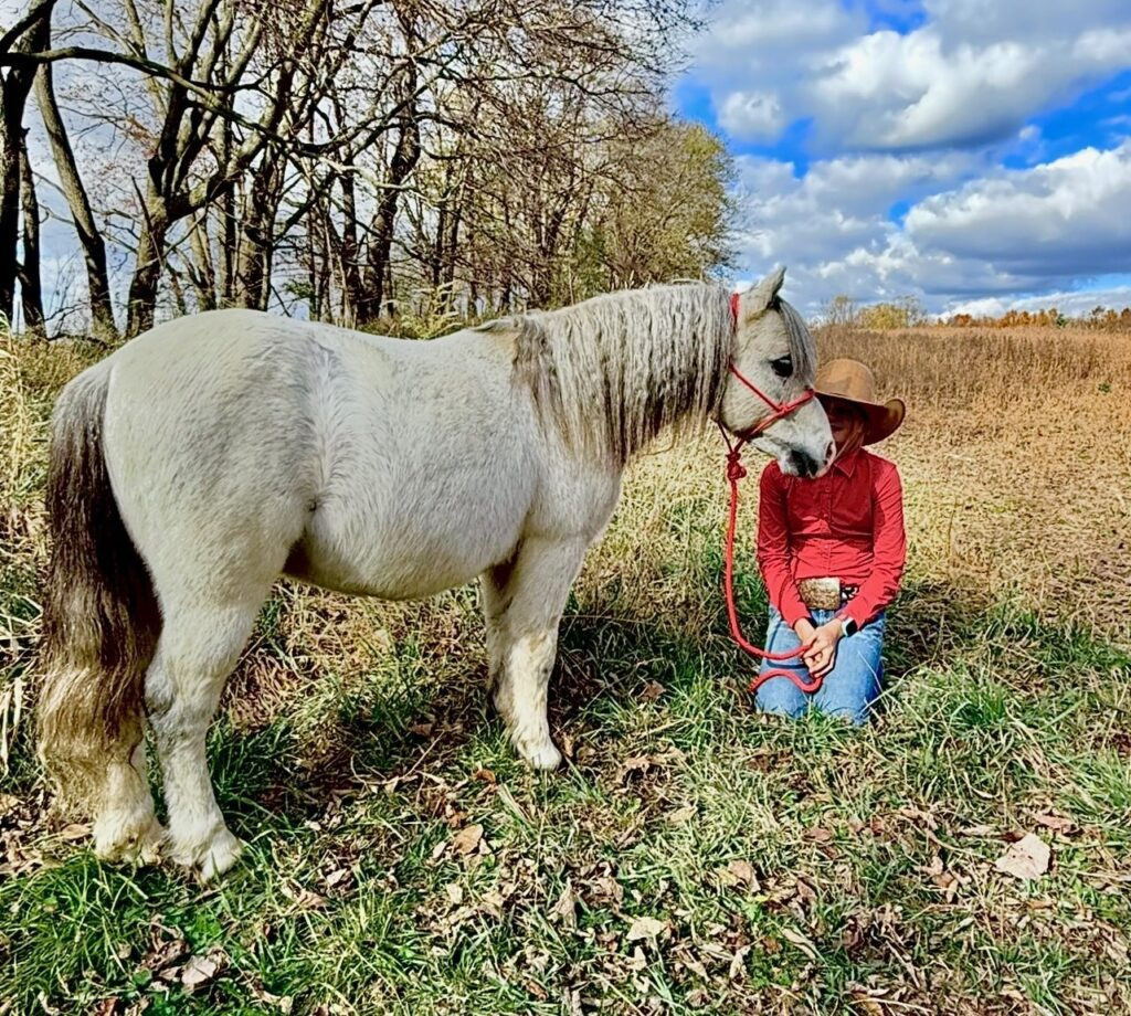 40 inches tall. Marshall is an absolute joy to be around. Marshall is different than most ponies his size- he will lope right out of his tracks in the smoothest, shortest lope you can imagine. Making him incredibly comfortable and easy to ride. Marshall has been hauled to Bible camps and rodeos, where he has pushed up calves, taught kids to ride, and cruised around the fairgrounds. He has even been taken to town during Halloween and the girls have trick-or-treated on him. Imagine all the wild inflatable costumes, kids yelling and screaming, touching him all over and Marshall handling it all with calm and grace. Marshall loads and hauls like a big horse and will stand tied to the trailer all day. He is very light mouthed, easy to guide, and a pleasure to ride. His ground manners are impeccable, stands for brushing, braiding, saddling, and also picks his feet up for the littles to clean out. Marshall is a true kids pony.