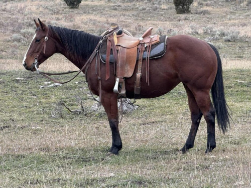 Teeter is a nice bay mare that’s been exposed to all aspects of ranch from the time she was started. She has paired out baby pairs, sorted, branded and gathered countless numbers of cattle. If I know it’s going to be a long tough day, in rough rocky country full of timer, she’s the one I rode, as she is sure footed, alert, and goes all day. With good black feet, good papers, and miles under her, she is ready for any direction you choose.