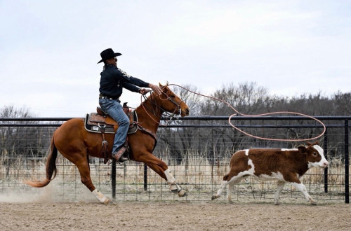 Denny is ready to go in any direction: heading, heeling, tie down, or breakaway. He is solid in the box, leaves flat, naturally quick footed and has a big, powerful stop. Roping has come very naturally to him, and he tracks livestock confidently.