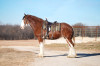 "Lily is a beautiful traditional bay Clydesdale with four white socks. Standing 17-3 hds. Stands well for the farrier, clipping, and bathing.