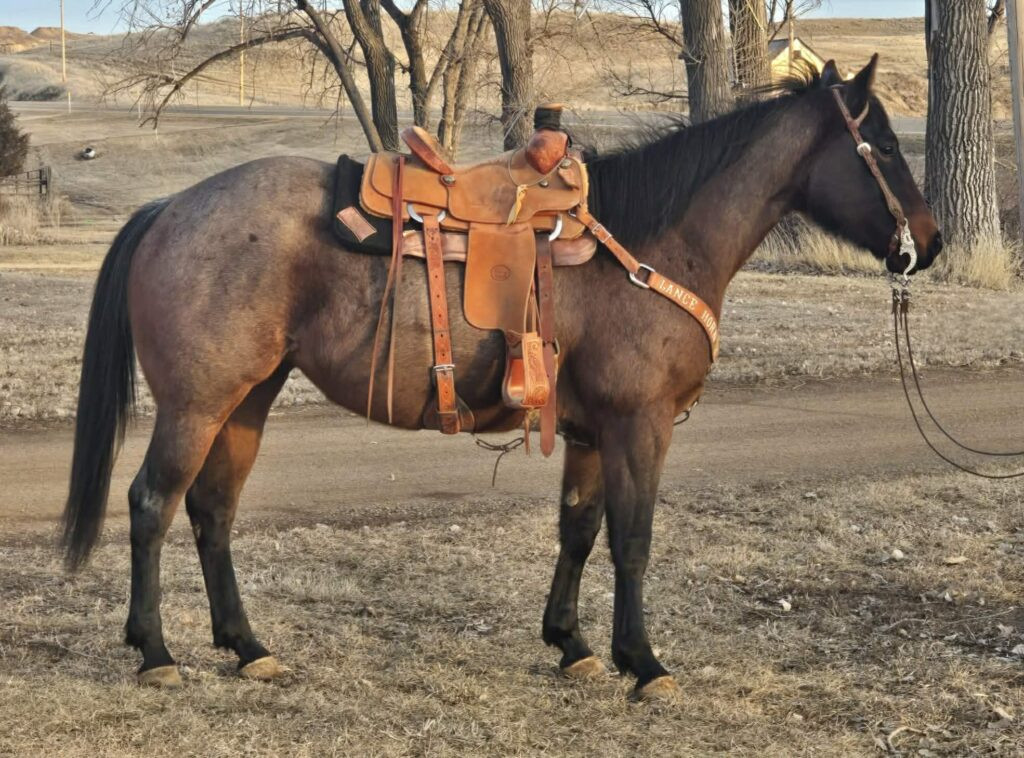15.2 hh 1250 lbs. Maternal sister to the Stevie Rey Von son that topped the sale last May. Been ranched on and used outside to sort, doctor and do all the ranch jobs. She can ride very collected in the bridle and really stop. Head horse size and capable. She has not been started in the arena but is darn sure ready. Make her how you like! Small scar on left hind at the coronet band. Does not affect soundness or hoof growth. Has had since she was a baby.