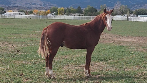 Halter broke and trained with a hot walker. Has round-pen etiquette and can stand and be tied. Able to have his feet trimmed. Has had a light saddle on him but doesn’t have any ride time on him. Has a scar on left thigh.