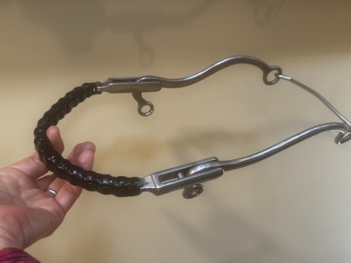 Roy Robinson Mechanical Hackamore features a bicycle chain noseband covered in black vinyl tape. It is stamped ROY on the inside of both cheek pieces. It is in excellent condition, does not look to be used much if at all. Cheek pieces are 7.5" in length. Weighs about 1.22 lbs. Price includes shipping.