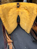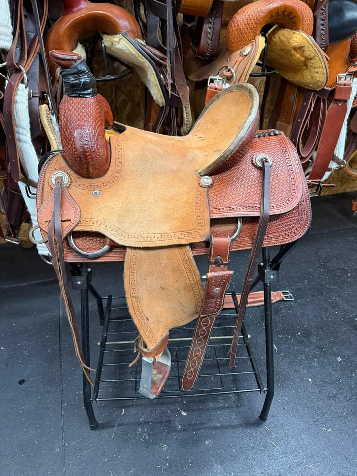 This saddle features a 12" rough-out hard seat, post horn, 6 1/2" gullet, QH bars, rawhide wrapped wood tree, back cinch, new latigo, fleece is good, and weight is around 20lbs.