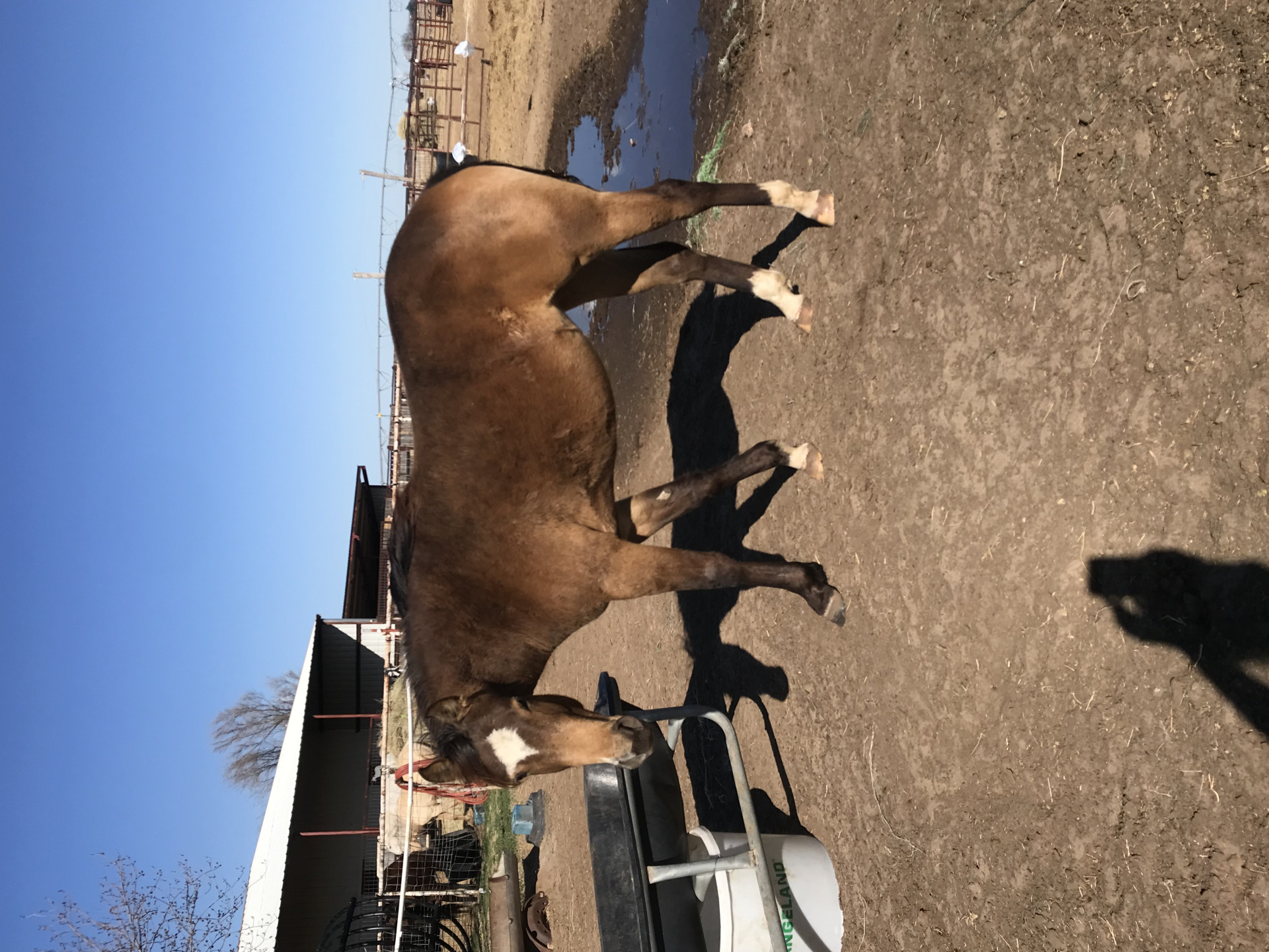 This big, stout filly has a huge hip and wide front end with a lot of bone under her. Correct in every way with a big star and 3 white feet. Foundation cow bred on both sides, DNA done and is 6 panel N/N. Leads, loads, stands tied and will mature to 15+ hands. Located west of Hennessey, OK.
