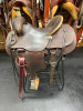 This saddle features a 15.5" hard seat, 4" rawhide bound cantle, post horn, 14" swells, 6 leather ties, stainless rigging, breast collar dee rings with matching breast collar, 7" gullet, FQH bars, rawhide wrapped wood tree, new half-breed off billet, new latigo, new front cinch, fleece is good, and weight is around 43lbs.