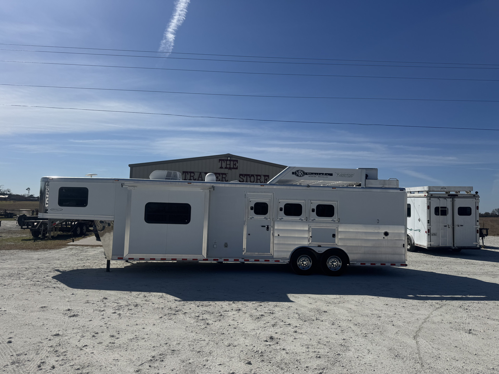 This trailer features a SIDE LOAD and GENERATOR. The horse area includes stud dividers, MANGERS, a first horse escape door, and a pass-through door to the living quarters.