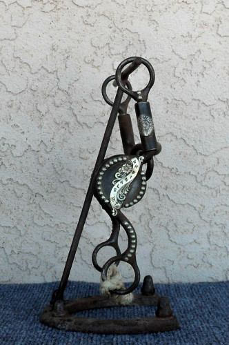 Just enough silver to add eye appeal to this very useable pre-owned bit made by Greg Dutton of Los Lunas, New Mexico. The measurements are 8 1/2" shanks—5 1/8” life saver mouth with inlaid copper strips for softness. Very desirabl bit. Left shank is numbered 124. $295.00 includes shipping to the lower 48. Please phone calls only.