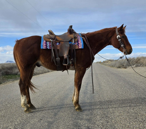 Some horses just have that good, honest feel about them, and Ike is one of those kind. Ike is a 14-year-old grade sorrel gelding standing 15 hands, and hes the kind of horse that doesnt mind whos climbing in the saddle. Kids, adults, or even the grandparents, Ike is happy to go along and take care of his rider. Hes steady, kind, and just plain easy to be around. Hes been down the trails, through the water, and rides around the arena nice and quiet. Hes had a rope swung on him and would make a fun horse for 4-H, family riding, or just being that good backyard horse everyone enjoys. Truth be told, Ike is the kind you grow pretty fond of. Hes quiet, sweet natured, and lovable, the type that meets you at the gate and enjoys a little sratch before you saddle up. Horses like Ike are what makes time at the barn feel pretty special. If your looking for a good-hearted gelding that the whole family can enjoy, Ike might just be your kind of horse. we offer 5 days free after the sale, then $10 aday for feed and water. Consigned by: Sixshooter Livestock 801-386-1404