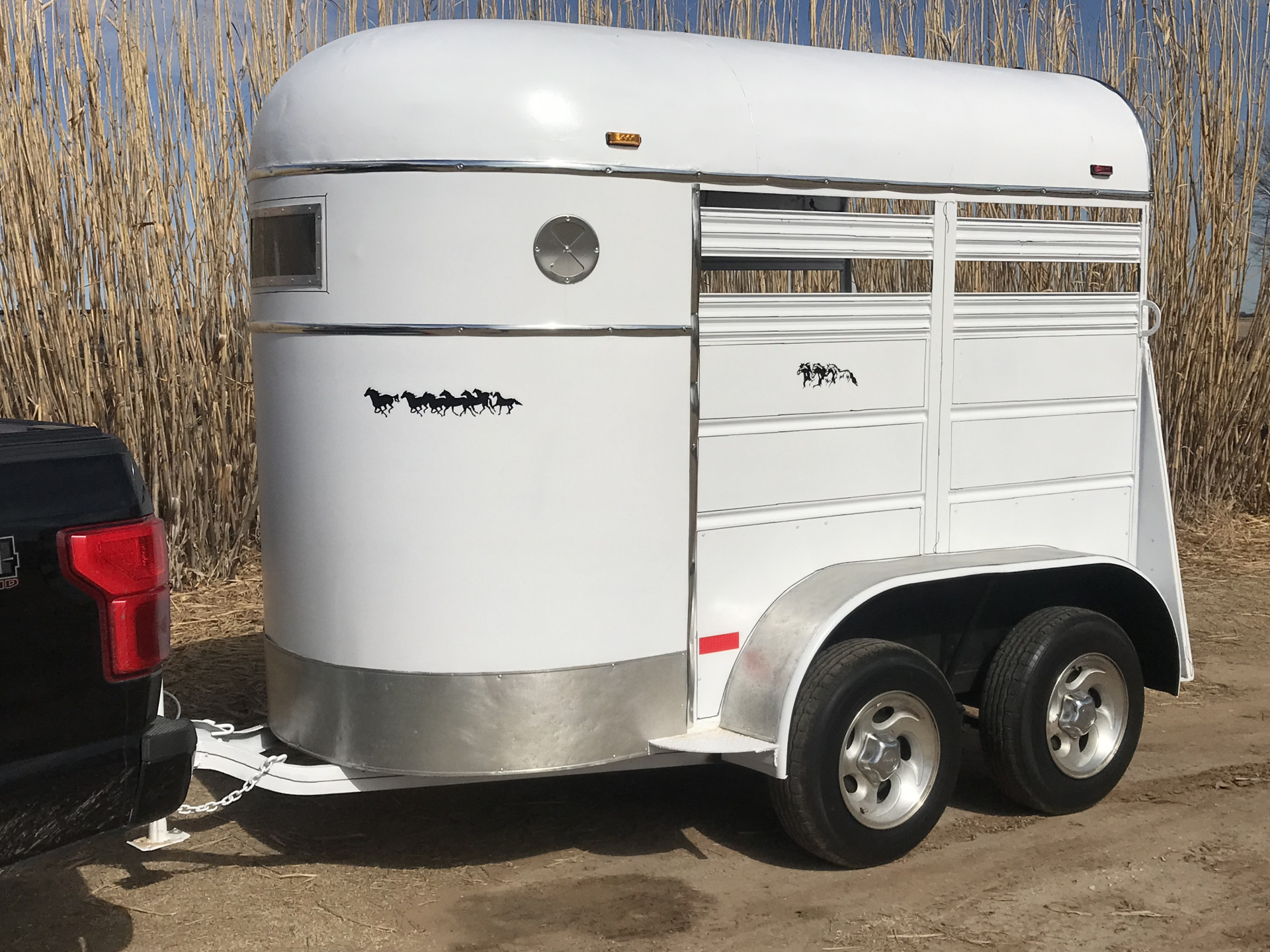 Beautifully restored 2 horse trailer with new paint inside and out, all seams are sealed. No rust ever! New tires on custom aluminum wheels including spare, wood jack and lug wrench. All wheel seals replaced and bearings packed. New treated/oiled wood floor with full mats including walls. New wiring, plug-in and LED lights inside and out. Manger has locking storage underneath. New chrome moulding, dual aluminum side vents, custom pin stripes and decals with horse shoe side ties. Full back gate for easier access with locking pin clip on latch. Measures 7’ tall, 5’ wide, 6’8” deep stall and weighs 2000 lbs. Pulls easily with an SUV. You will not find a nicer trailer anywhere! Bill of sale. Located west of Hennessey, Okla.