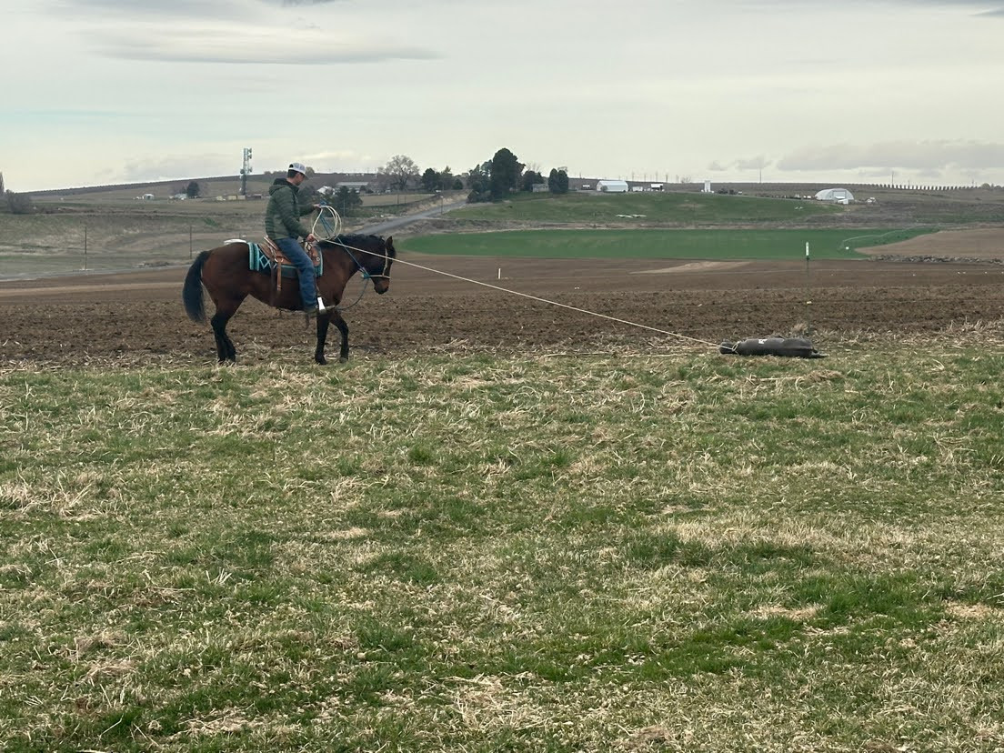 Kade has started roping off her—she is dragging the dummy and has ponied horses, showing a great start toward becoming a solid rope horse prospect.
