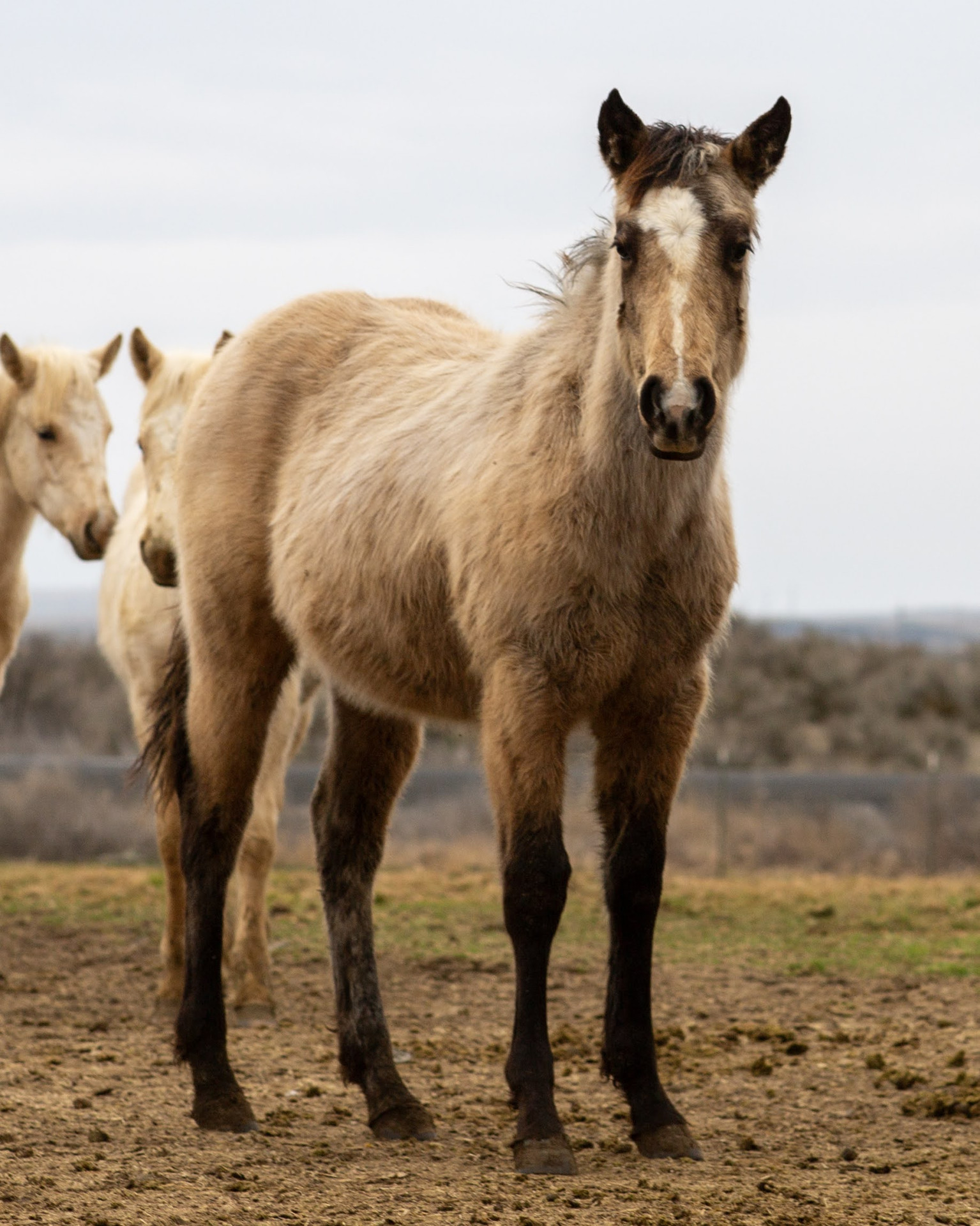 She’s a fancy blaze-faced buckskin filly with presence, personality, and brains. She was an absolute dream to halter break — smart, willing, and the kind that meets you at the gate because she genuinely loves attention.