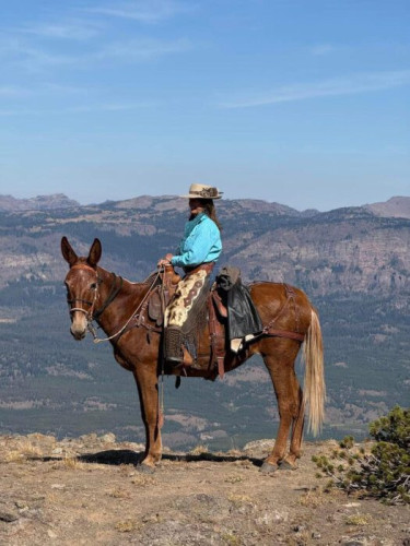 Lucky Charm is 15.2 hands and well-broke to ride and pack. We have used her two summer and fall seasons in our wilderness camps in Montana. She can really travel and will go where you point her. She is comfortable to ride and has a great wither to hold the saddle. Lucky Charm is good to catch, load, and shoe. She is easy to bridle and good with her ears. She has been ridden with either a crupper or a britching. Lucky Charm will pack anywhere in the string and has been packed extensively. She gets along with all the stock and winters well. Current on vaccinations and wormer.