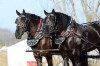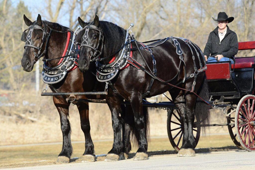 This extremely fancy pair of full brother Percheron geldings with long manes and tails go by the names of Rocky & Robo! Big, Beautiful, Black, Broke, Gentle, Safe, and Dependable are just a few adjectives I would use to describe Rocky & Robo. They stand 17.2 and 17.3 Hands, tip the scale at 1925lbs each, and wear a size 6 shoe. Rocky & Robo were raised right here in MN on a Amish farm, where they started their career under harness doing a variety of tasks from spring field work, to summers baling hay, to fall harvest. One task on the Amish farm that taught them a lot patience, was pulling the milk sled through the rows of calf huts to feed a couple hundred bottle calves morning and night. We have owned Rocky & Robo for a year and boy have they become a staple in our business. We used them extensively throughout the holiday season giving horse drawn rides to hundreds of people. Rocky & Robo did the honors of hauling people at “Ole Fashion Christmas” in Plainview, “Jingle Mingle” in Leroy and the “Holiday Light Tour” in Preston many evenings. Our most recent event we used them for was a family wedding in February. We have used them to drag our arenas this winter and hauled countless loads of manure out of the barns down the busy highway to our field over the past year. I could continue to write about Rocky & Robo for pages, as they are an extraordinary cool team that I thoroughly enjoy driving! Current on dental, deworming and farrier.
