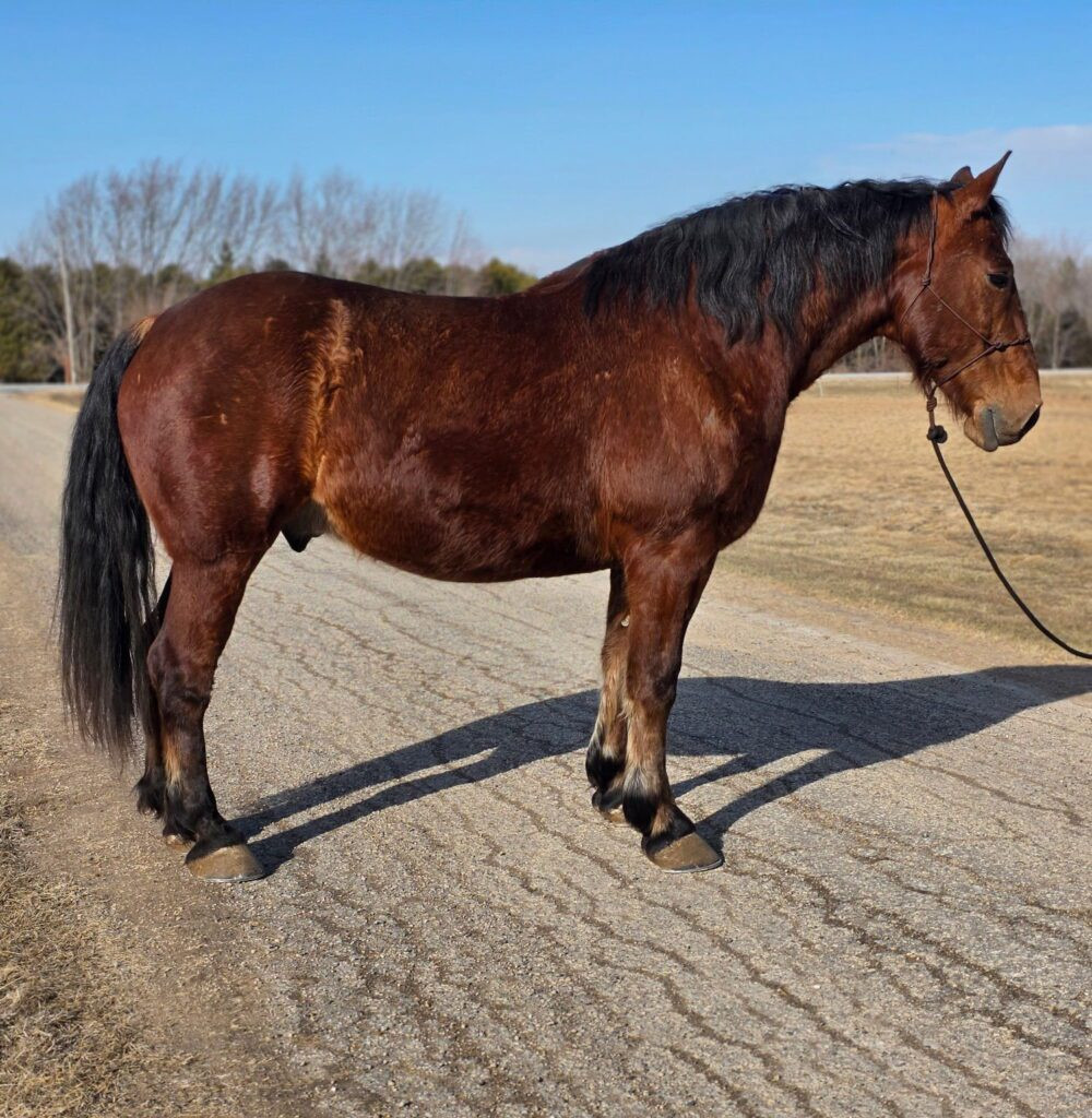 16.2hh 1400lbs. Moses is broke to ride and Drive (single and double). Pulls strong and works hard. Traffic safe.