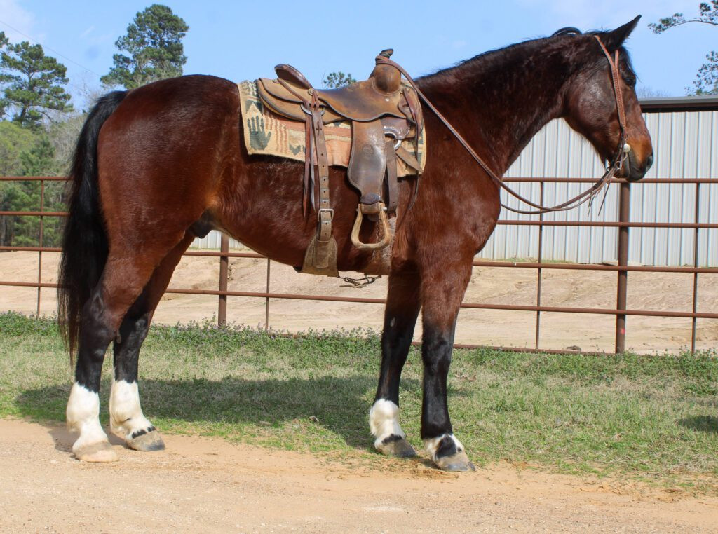 Big, solid trail riding horse built to comfortably carry a rider all day. He’s sure-footed in rough country, crosses creeks, steps over logs, and handles hills and uneven terrain with ease. Quiet-minded and steady, he’s the kind you can saddle up and head down the trail with confidence.