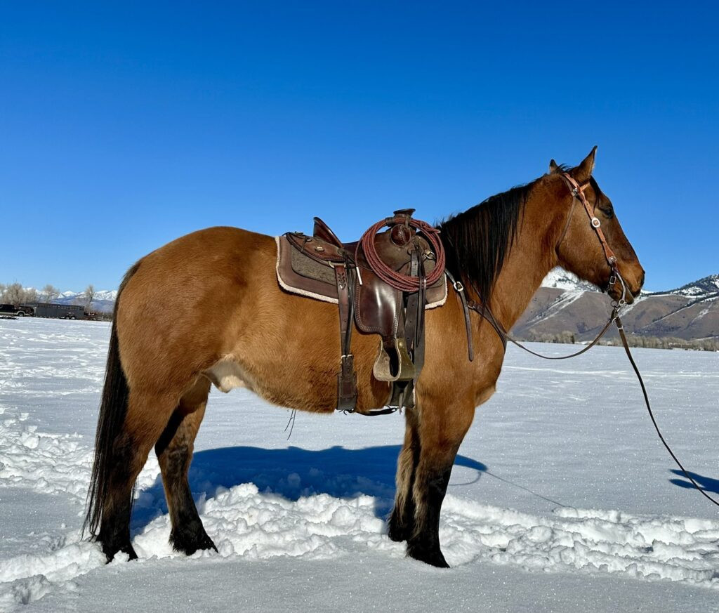 Butch was born and raised on the outfit. He has been one of the great ones for us and has seen almost everything a horse can experience in the mountains. He’s been a guide horse, guest horse, kid horse, pack horse and whatever else we have asked him to do. He is super gentle, kind and safe for anyone to ride. Butch does slap down his hind foot at a walk but it doesn’t slow him down. Butch would be great for someone looking for a gentle safe horse to enjoy. Contact Seller. FMI: Dustin 307-690-2521. Coggins. MO138