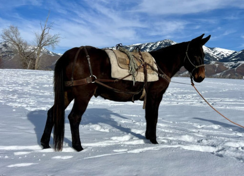 Buckeye is a big stout mule that’s been part of our string for 3 years. We have mainly used him as a pack mule but he has been ridden also. Buckeye does best just following along he rides Gee and Haw but gentle. Easy to catch and wants to be your friend.