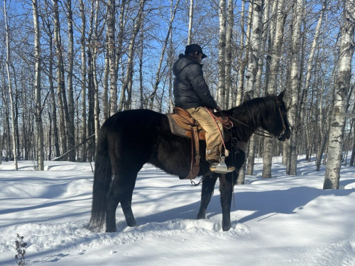 Bee is a solid crossbred mare that has seen everything from ranching to the rough country. She’s solid enough to snub colts, drag anything you dally to and gentle enough the kids can ride her. Shes been used at the market and will watch a cow. This mare will cross logs, water and bog. Seen the mountains numerous times. Good with her feet, baths and clips.