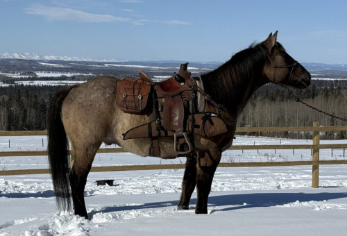 Ash is a 12 year old draft cross gelding, 16hh, with a size 2 shoe and solid black feet. He is easy to catch, load, and stands for the farrier. Ash is a mature gelding that would be a welcome addition to any operation and who anyone can ride. He is no stranger to camp life, river crossings, hobbles, bells, chain saws and high lines. We refer to him as the dump truck as this mature stout gelding has packed it all. Horns, tents, saw boxes, Ash will carry the load. He socializes well with other horses, has been packed in a string and is not easily rattled. Ash is no stranger to cows and has roped the heel-o-matic and used in the feedlot. He’s no stranger to a hard day’s work. Light mouthed with a good stop, neck reins, and side passes to open gates. Ash is build solid, patient, and would be a welcome addition to any dude string or ranch. He will take you anywhere you want to go!