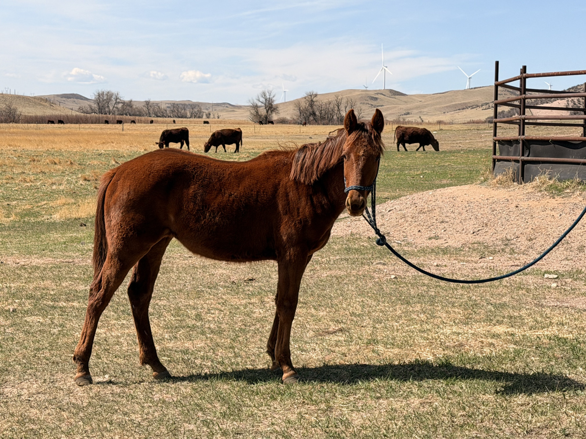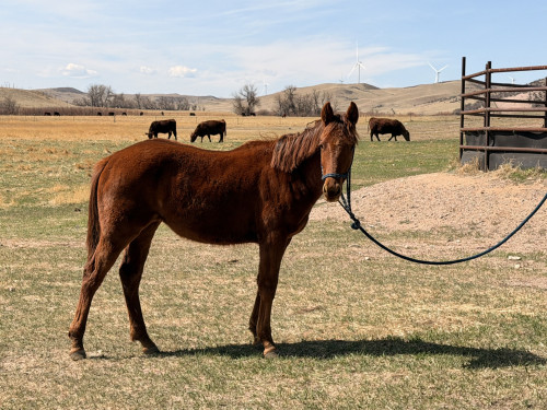 This Filly is as friendly as can be. You can catch her in the pasture. Mare is Cutting bred from Texas and stands at 15 hands. Stud is a grandson of High Brow Cat and stands at 14.2 hands. This filly should be very cowy. She leads, loads and you can pick up her feet.