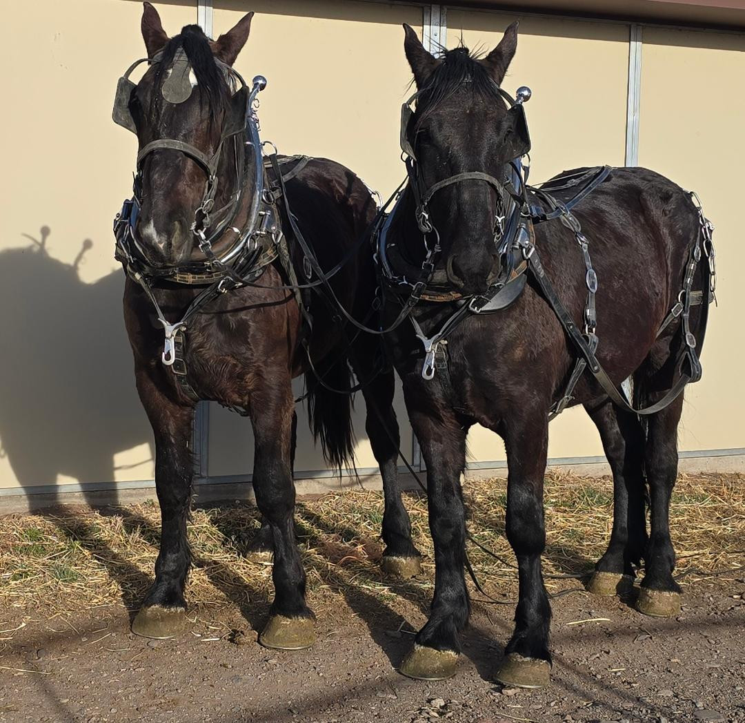 "Mark and Max" 3 yr. old Black Percheron Geldings. They stand at 17hh, are well-broke to drive and experienced with all types of farm machinery. They are reliable in traffic and behave well on the highway. Additionally, they stand quietly to be hitched. Just a young, quiet team!
