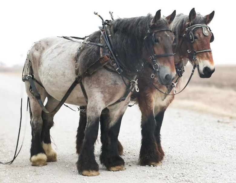 "Nikki & Fenna" 7 yr. old Bay Roan Brabant Mares. They are Registered and were imported right from Belgium. We have used them on all different farm equipment. They have been down busy highways, through town, and given lots of wagon rides. They’re friendly, quiet, and easy to handle. Nikki and Fenna are easy to harness and hitch. This is not a team you have to drive every day; you can let them sit and they drive the same the next time you get them out. A very cool team!