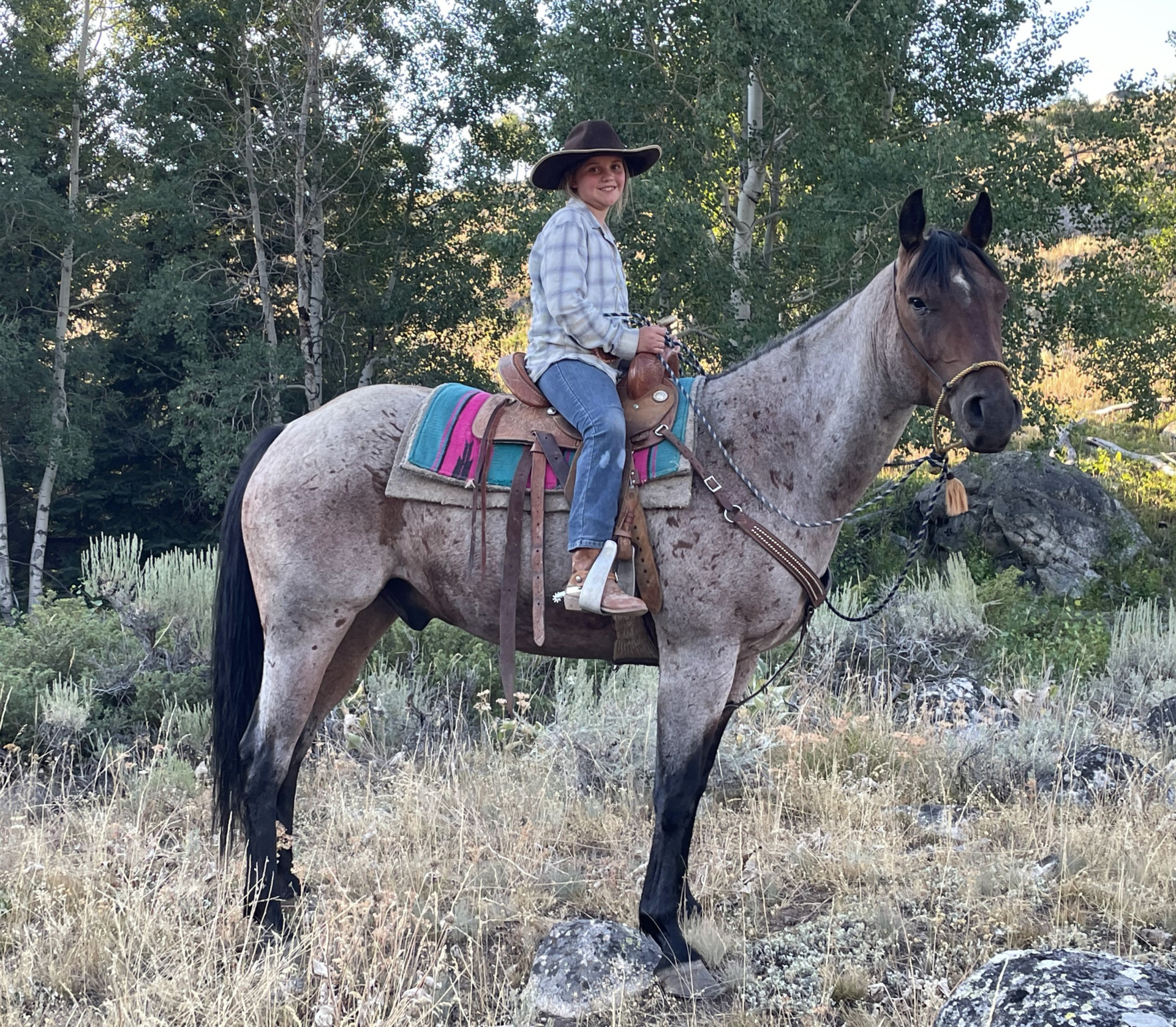 Royal is a super gentle, easygoing 8 yr old AQHA quarter horse gelding. He has spent his entire life ranching. This life entails roping, doctoring, trailing cows, long days in the saddle etc… He spent 1 year working on a yearling operation high in the Absaroka Mountains, so he has lots of mountain experience. He has been hunting, packed on, lots of trail riding, used as a working horse and a kid’s horse. He neck reigns, works off of leg cues and can be ridden in a bit or just with a rope around his neck. We ride him mostly in a hackamore because he is just as responsive with it, as in a bit. He can ride at the front of the pack through rough trails or follow easily in the middle or back. He will go off alone, away from the group if asked, or just follow along. He is incredibly gentle, patient and easygoing. But when he needs to, he can get moving quick and get the job done. He has no spook, buck, or squirely-ness at all! He can babysit the little’s or inexperienced person or put someone on him that knows how to work and ride, and he can chase down the wayward calf or rope and doctor that big old bull. he doesn’t rush back to the barn when headed home or become barn sour when leaving. He is the perfect all-around ranch horse! Not only does he have extensive experience, he is also young, a beautiful color and has good conformation. This handsome fellow is finished and ready for a job. Contact Jan & Russ Olsen at 307-921-9590 for more information.