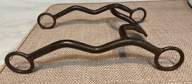 Good older marked Rod Teuscher stiff bit. Rod is out of Texas and makes some nice bits. No issues. It has his L4 mouthpiece. Lays flat. 5" mouth and about 9" Long