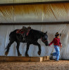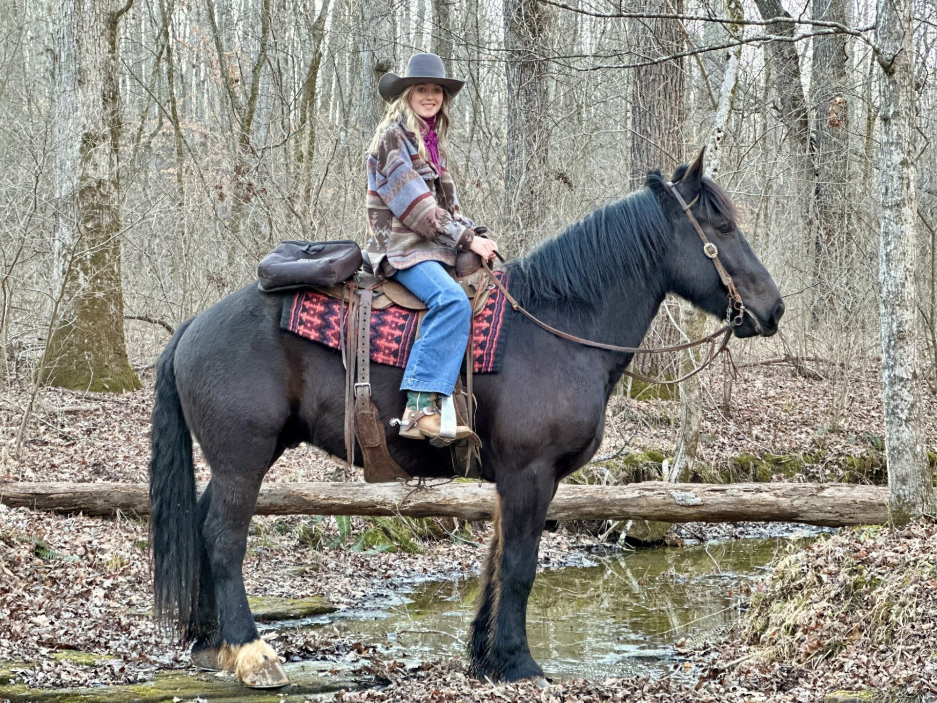 Titan is a beautiful black Percheron/QH Cross gelding. 6yo with his whole life ahead of him. Standing a stout 15.3hh, this guy can pack a larger rider & look great doing it. Don’t let his size fool you, though. This big guy is athletic when you ask him to be & he loves to jump!! In our videos, you’ll see a young man take him over some jumps with ease; that was his first time riding Titan. He is user-friendly for all. He has been used this year in my lesson & guided trail riding programs. As well as being leased out to competitors who want to attend our horse shows & don’t have a horse of their own. Titan steps up to the plate when someone needs a friendly & fun ride. Navigates the tough trails with ease. Willingly crosses all types of obstacles in hand & under saddle. He’s done great at the extreme trail challenges. He’s sure-footed & goes over downed trees, through mud & up rocky trails without issue. He makes riding fun. Our lesson kids call him one of the favorites. He loads on many styles of trailers without any fuss & backs off like a pro. His sweet & gentle disposition makes him a great mount for an intermediate rider. This boy loves cattle work!! Ridden weekly at the stockyard & adds more cow sense each time. He really enjoys that work. He stands great for clipping, farrier & vet exams. He sells sound & ready to go to work for you. This guy rides like a dream & is adding buttons all the time. As good as he rides, he drives just great! This guy backs in the shafts & waits for your cue. Perfect for carriage rides, field work, or pony parties. Titan sells UTD on teeth, shots, and farrier work & is being offered with a full vet exam & check up. Buy with confidence!! He loves to stand for hours of grooming from the little kids. He’s great for mounting, bathing & many other tasks he’s been asked to perform. He’s an all-around good boy. Easy to halter & bridle. Gets along great with others in the field. He stalls or pastures great. Picks up all 4 feet when asked. He’s been a pleasure to have at our place. Whoever gets this big guy will have a friend for life! Call or text us to come to For His Glory Farms & Arena LLC in Woodburn, KY, to try Titan today!