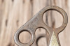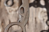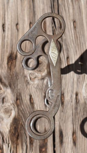 Nice older polo bit. Marked MCCHESNEY with a Pat’d date. Simple diamond mountings, engraved. Intact and original. Cheeks are 6 1/2" long, mouth is approx. 4 3/4". Good condition, light surface rust and patina.