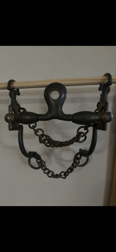 Swept loose seven shank Cyprium bit. Adjustable chain curb strap. Side rollers on the spoon mouthpiece. Price includes shipping. Call or text with questions. 605–8 90–3950.