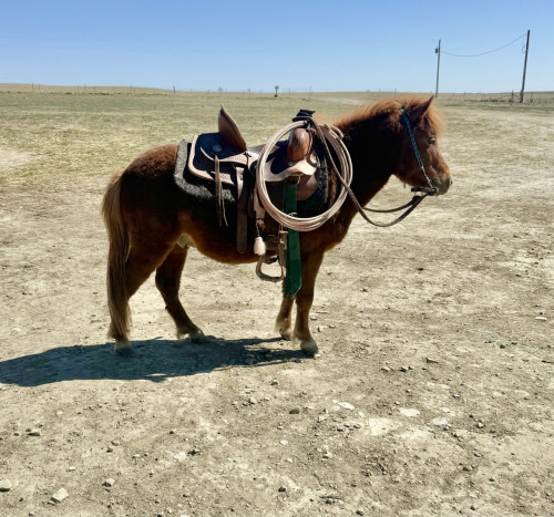 38”. Red is broke to ride and drive! He is not for a beginner but most kids could get along with red just fine. He’s been around, dogs, livestock and traffic. Feel free to come try him.